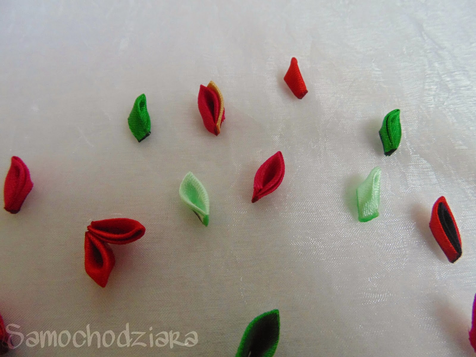 LEGO ;) Wstążkę wystarczy dwa razy złożyć na pół po skosie skleić rogi i już mamy płatek